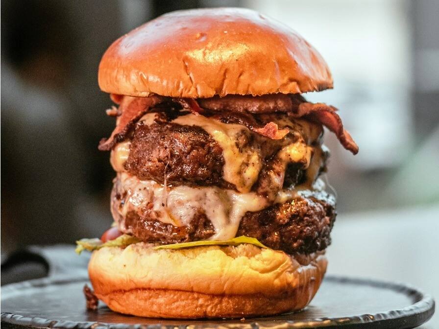 Dois burgers de 180g de angus, um com queijo mussarela, outro com queijo prato, bacon crocante, alface americana e tomate cereja.